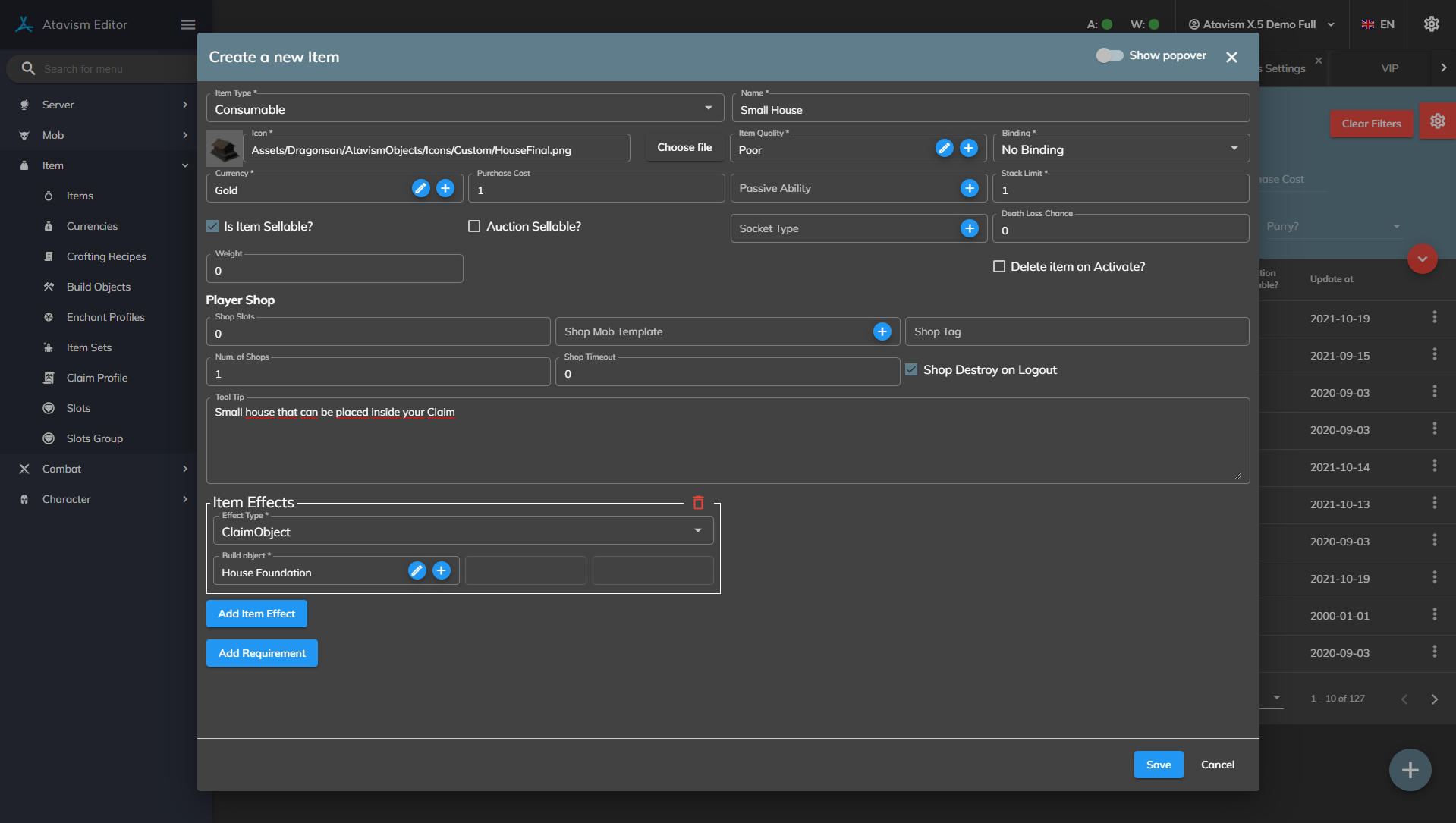 - Items Required allows you to set up to 6 different materials required to construct this build object.