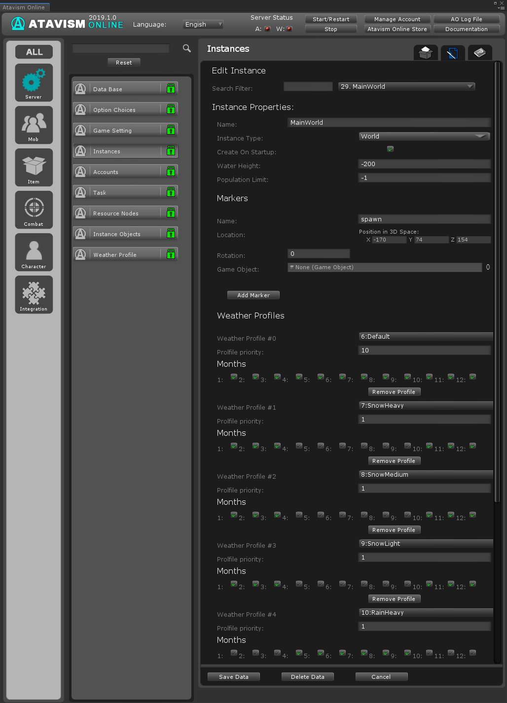This is where you set up your instances. By default, the MainWorld instance is already set up. If you have more instances (Unity Scenes) to setup you will do it here. One thing to make sure is that you add the scene to the Unity Build Settings or Atavism won’t find that instance when it’s running.