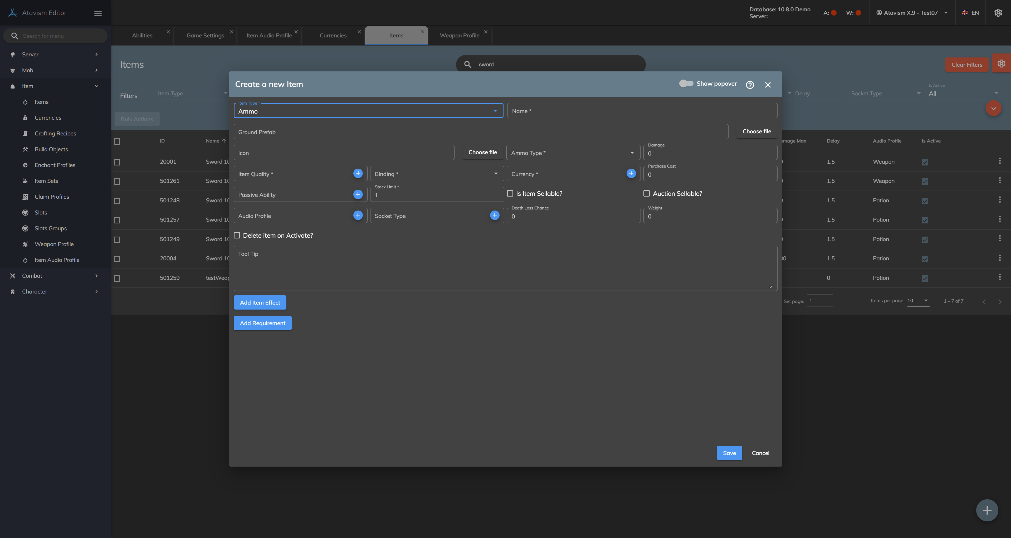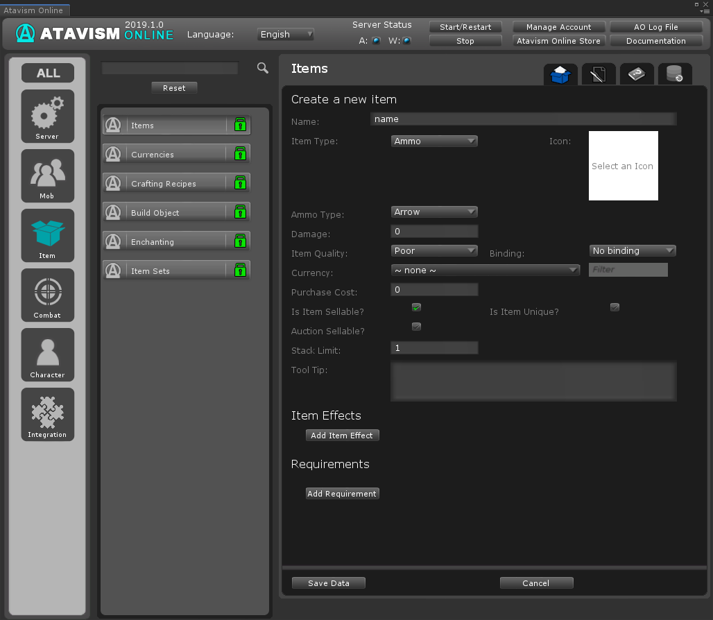Weapon Profile: Defines what ability will be assigned to the weapon and to which Action. Action can be bound to any key or mouse button. More information about Weapon Profiles can be found here. This field is only for weapon item type.