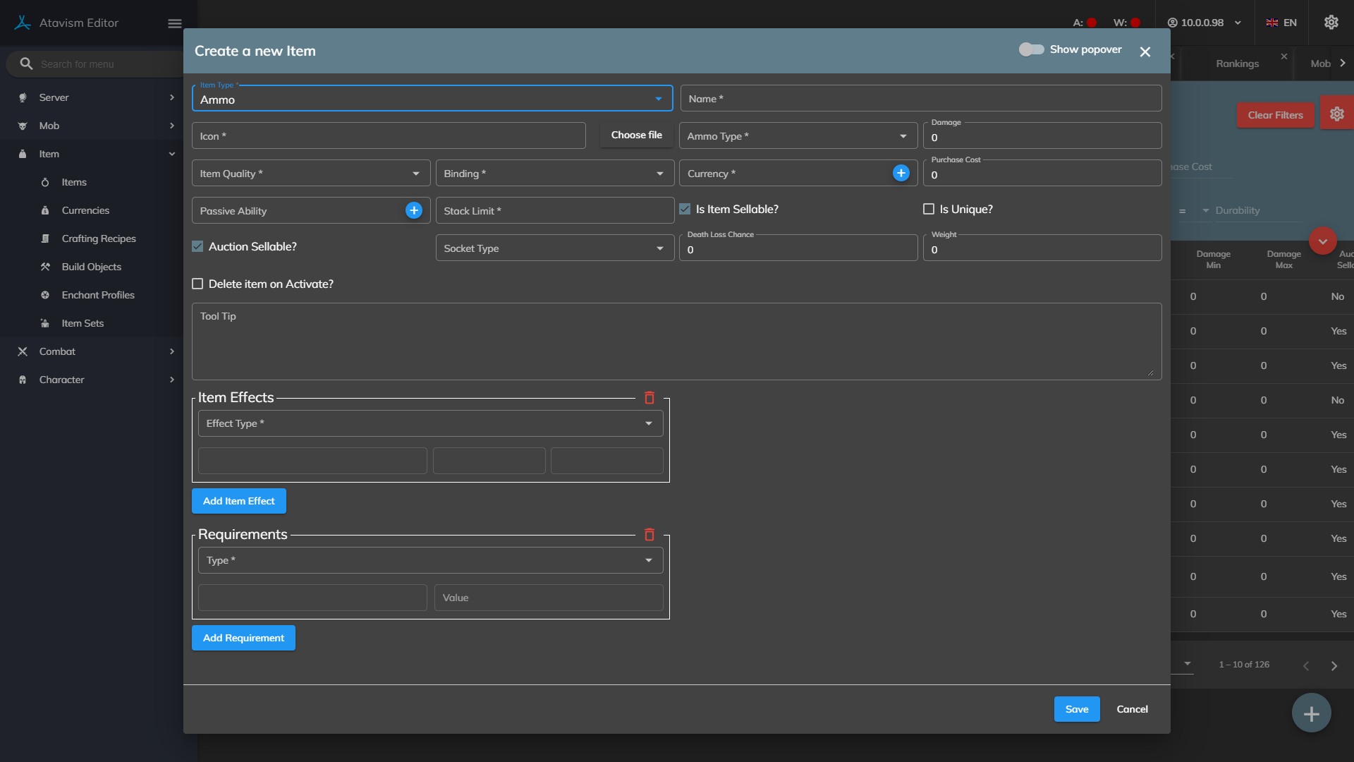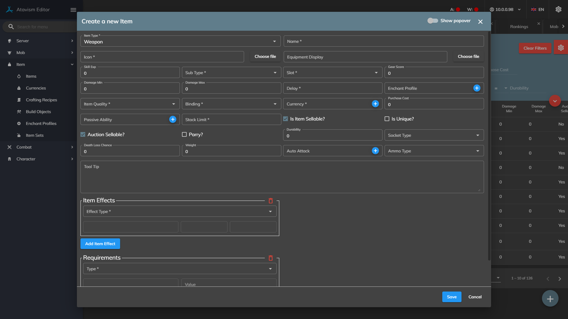 Draw Weapon CoordEffect Duration (ms): Defines the duration that will affect your character and make it busy until the weapon is unsheathed. This field is only for weapon item type.