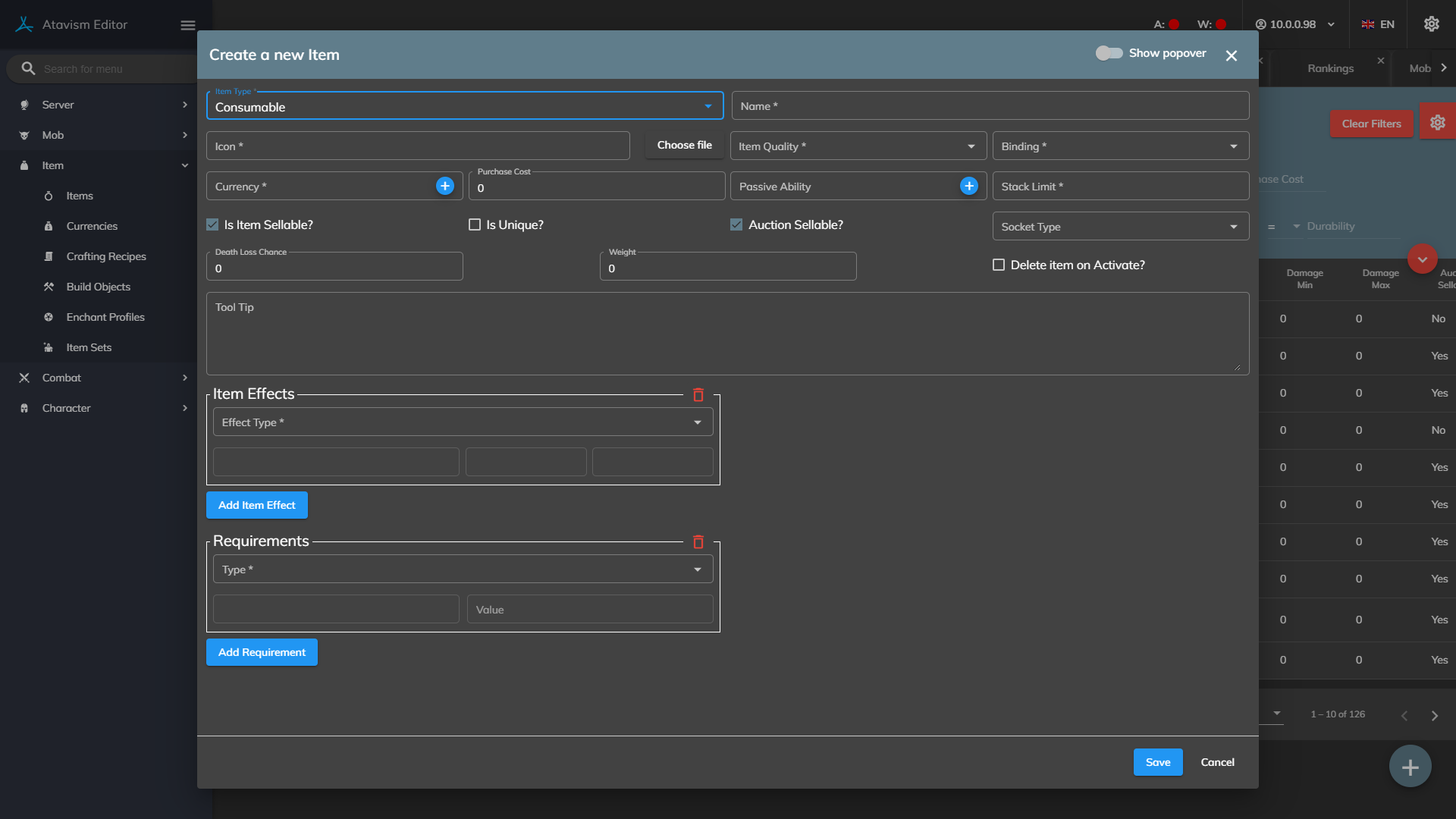 Click on the Mob/NPC button in the left pane then on Loot Tables in the second pane. Give the loot table a name, then choose an item from the dropdown, give it a chance to drop, and specify how many of the items will drop. To add additional items to the table click Add Item. Click Save when you are happy with your loot table.