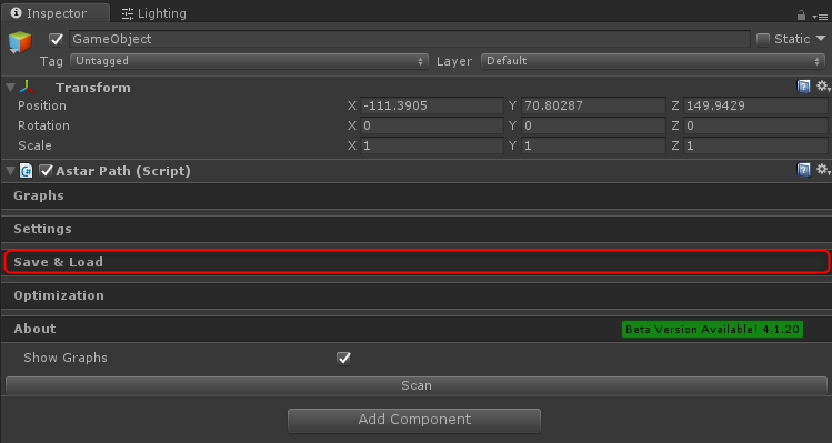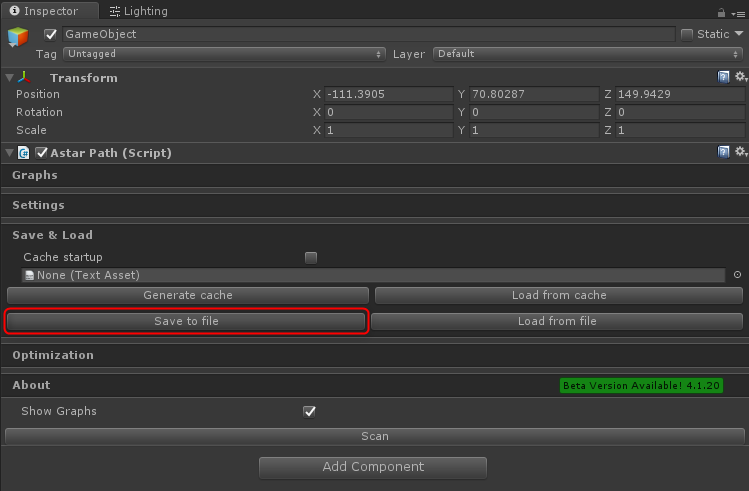 - Select the directory where you want to save it. The most important part is that name of the file must be corresponding to the Atavism instance name, for example, if you are preparing NavMesh Graph for MainWorld Instance then the file should be named as MainWorld.bytes. and click save