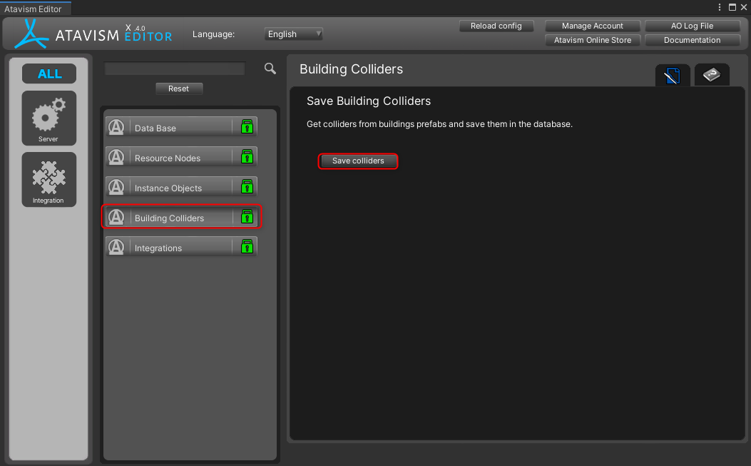 For dynamic navmesh you have to use primitive colliders. Right now supported are boxes, spheres, and capsules. To save them you have to open Atavism Editor inside Unity and select Building Colliders and then click the Save colliders button that will analyze all prefabs assigned in the Building Objects and save colliders in the database for them