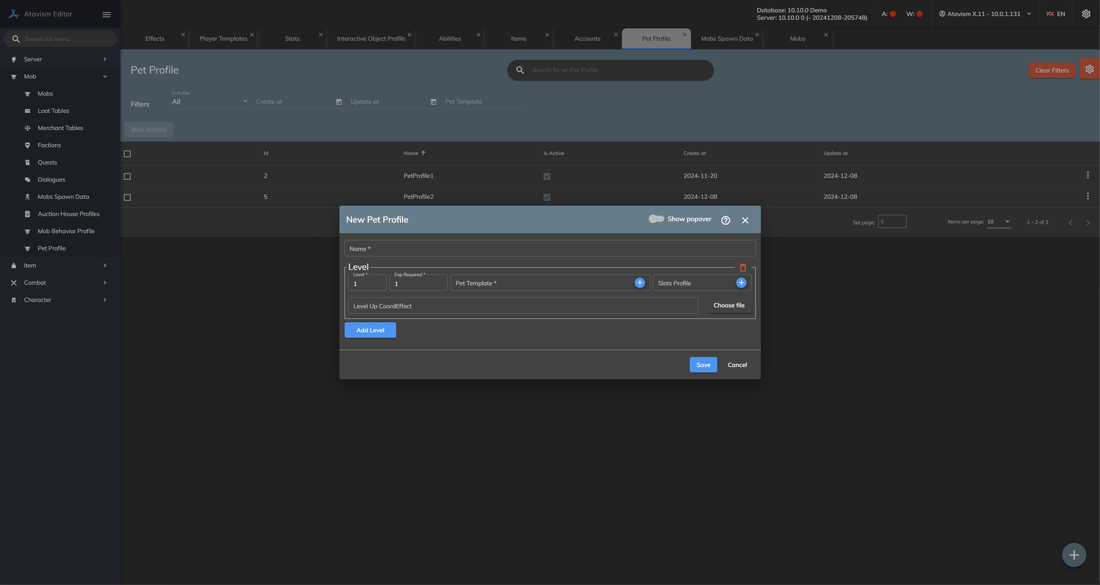 Pet Template: Defines pet template that also defines its all parameters like model, behavior, abilities, statistics, etc.