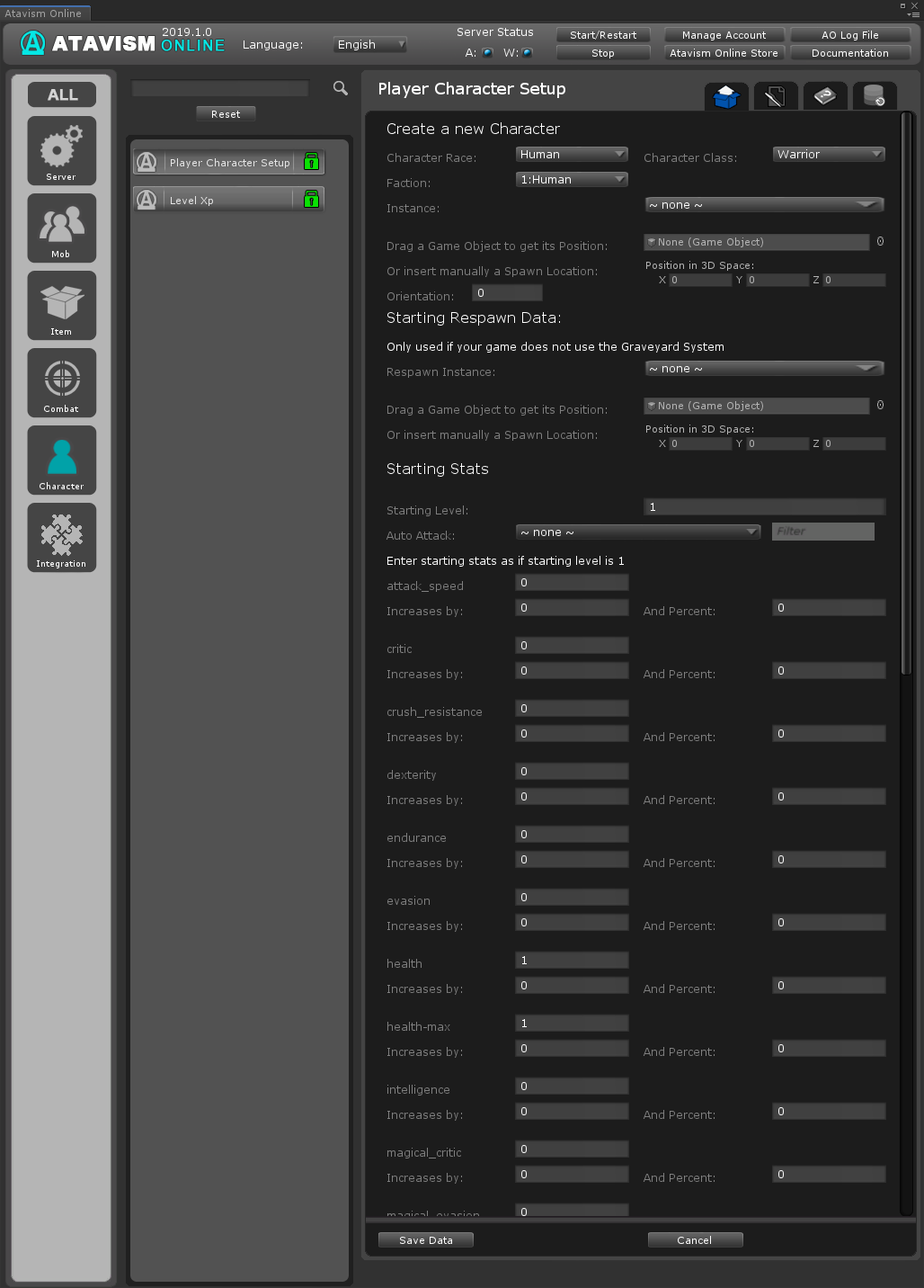 The starting value of stats and how they increase as the player levels up can be set for each Race/Class template. It follows the format of starting stat value, how much the value changes each level (as a number), and then how much in percentage it changes. The formula is: