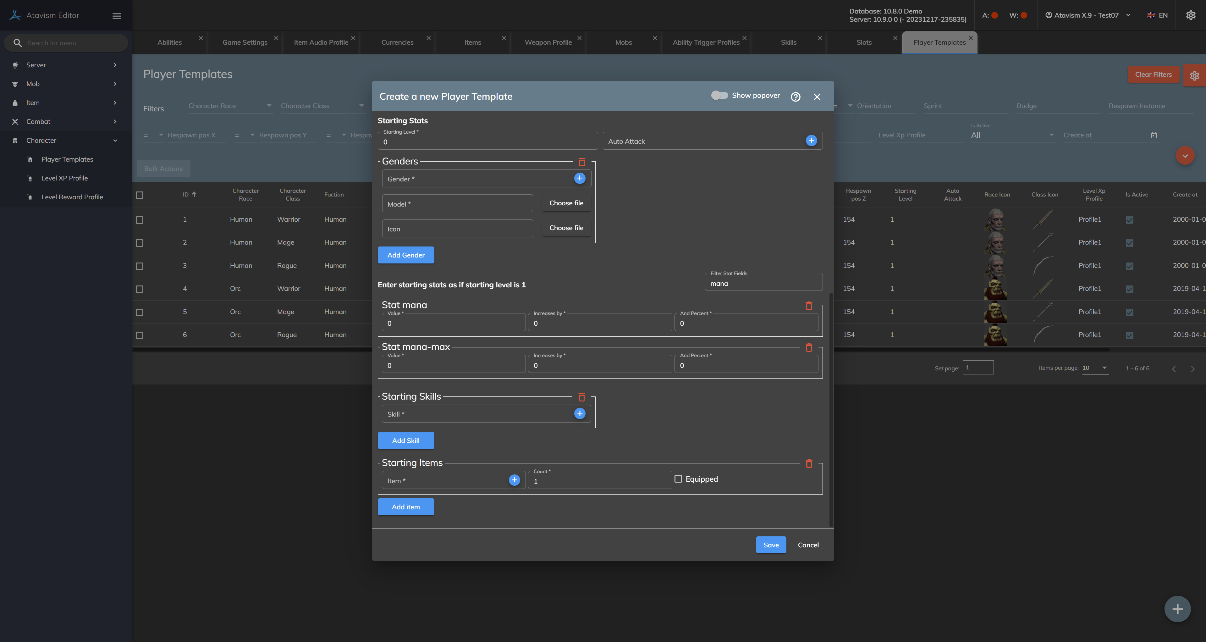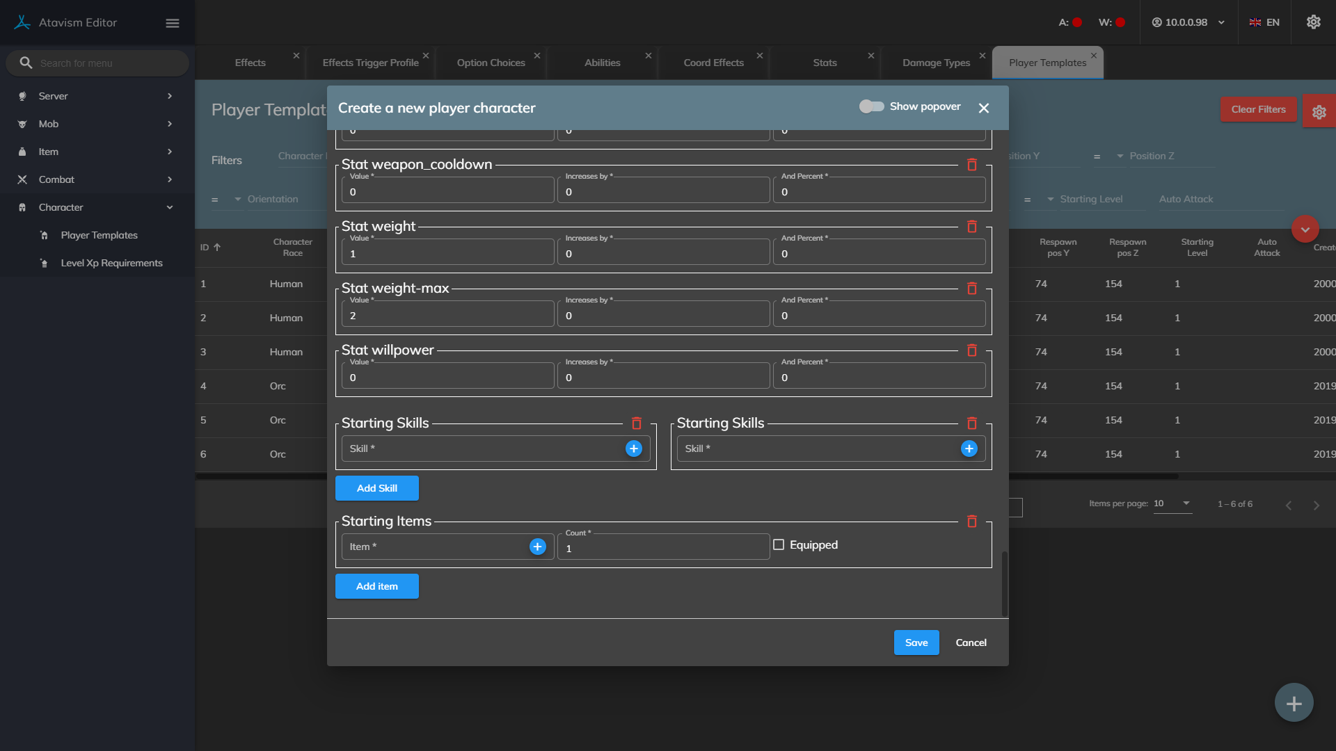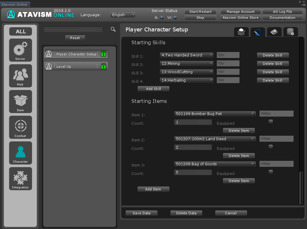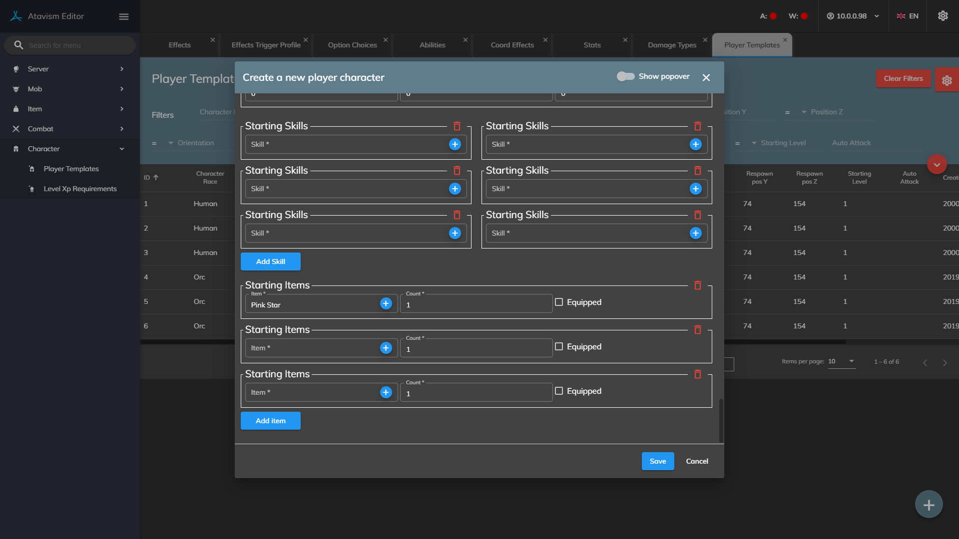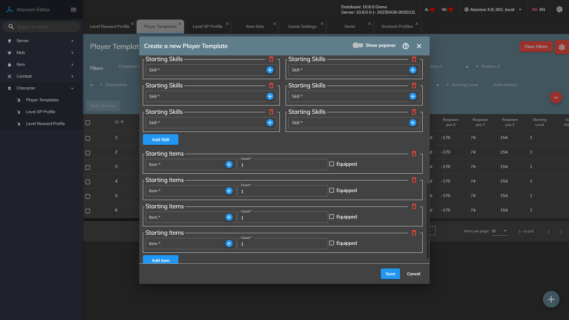 Here you can set items that players will have on start. Just like Skills, there is no limit to the number of items that can be given to a starting character (but take care not to fill their bags too much). The amount of an item can be set (count) and whether or not it is equipped on the character.