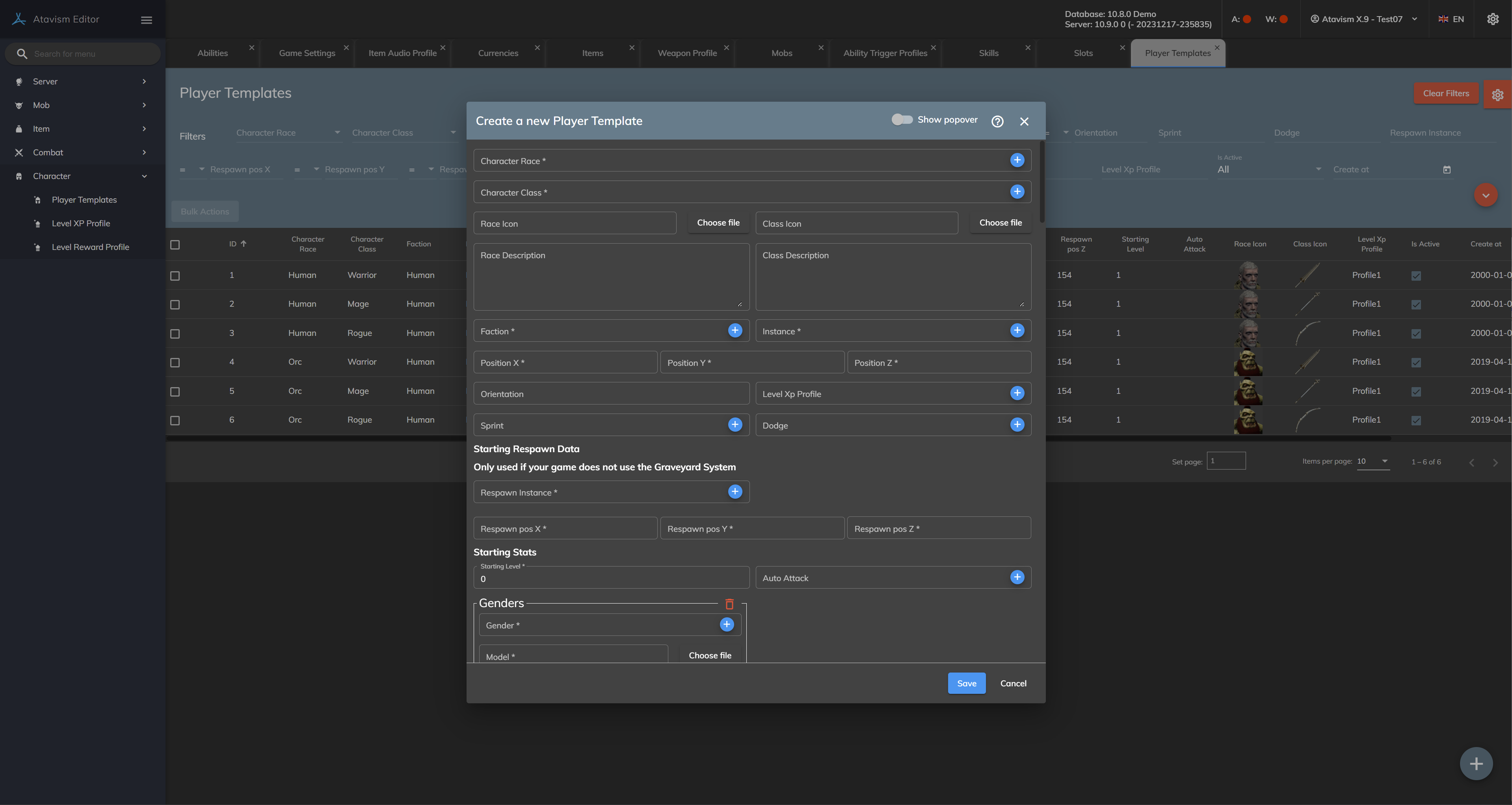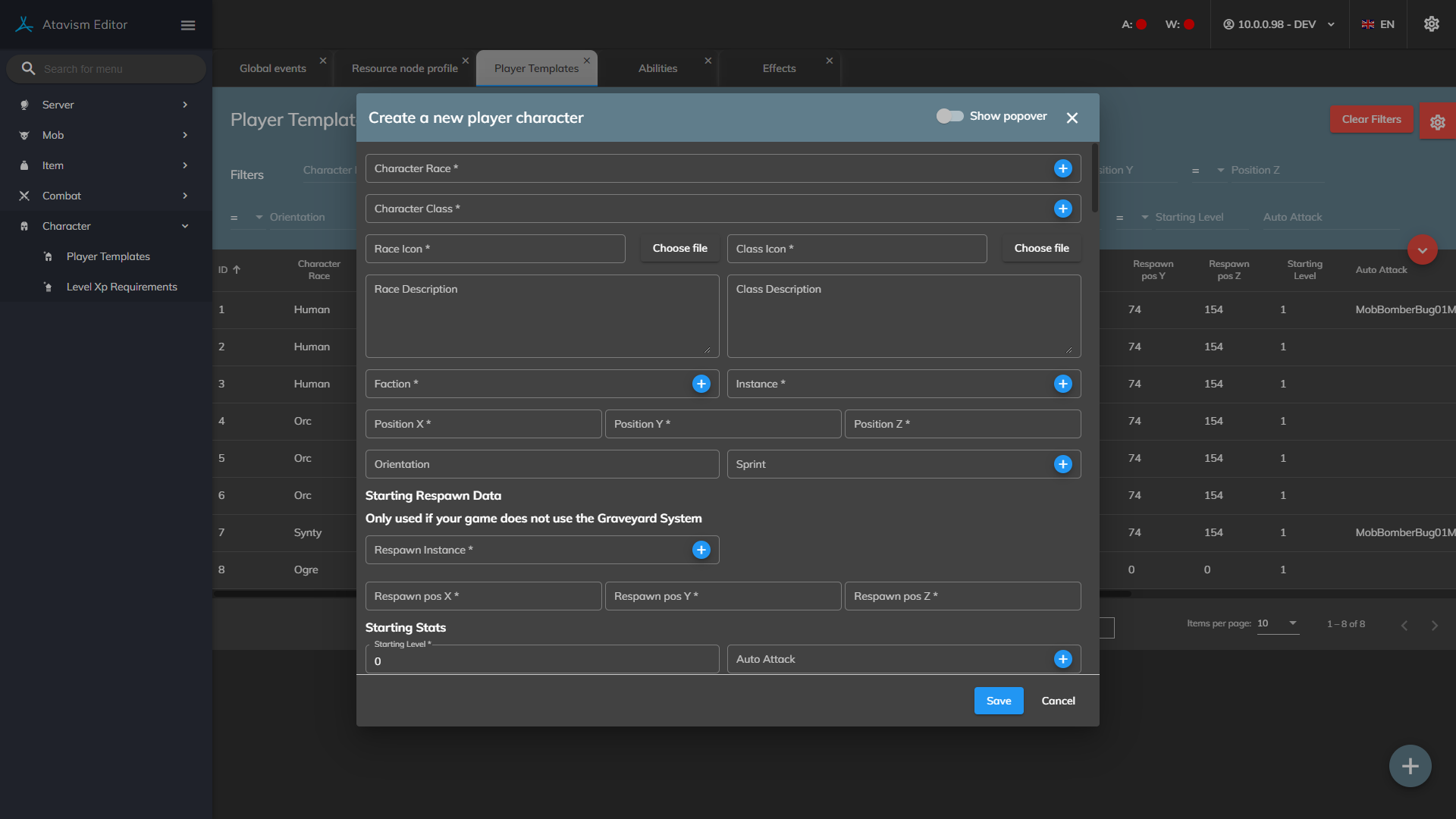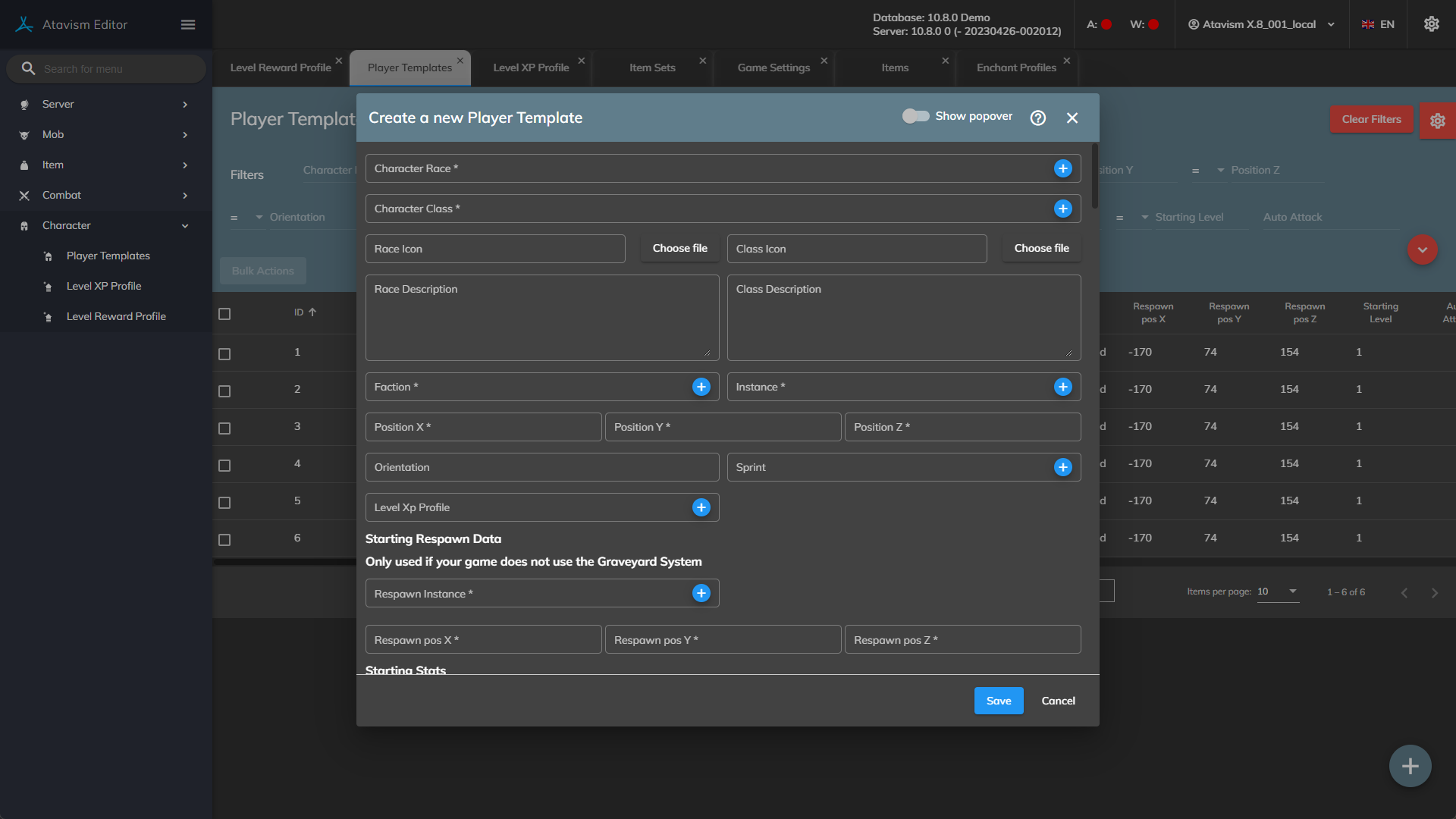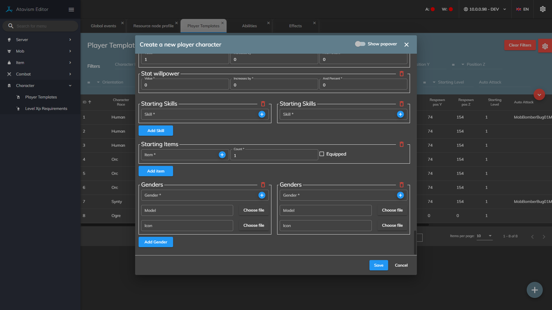Here you can set items that players will have on start. Just like Skills, there is no limit to the number of items that can be given to a starting character (but take care not to fill their bags too much). The amount of an item can be set (count) and whether or not it is equipped on the character.