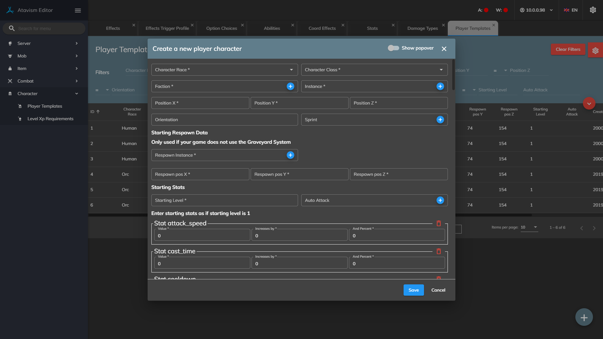 The starting value of stats and how they increase as player levels up can be set for each Race/Class template. It follows the format of starting stat value, how much the value changes each level (as a number), and then how much in percentage it changes. The formula is: