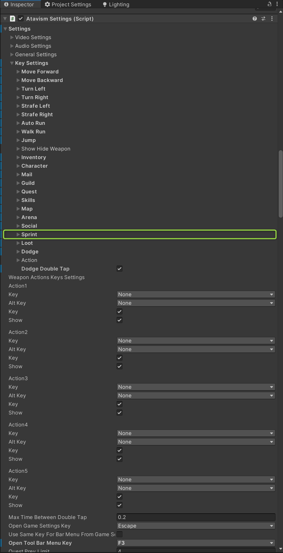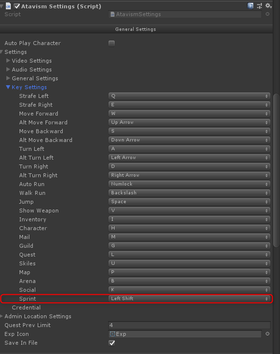 Sprint: Defines the ability that will be used for the player sprint effect. Sprint as any other key can be bound in the Login scene -> Scripts -> Atavism Settings component.