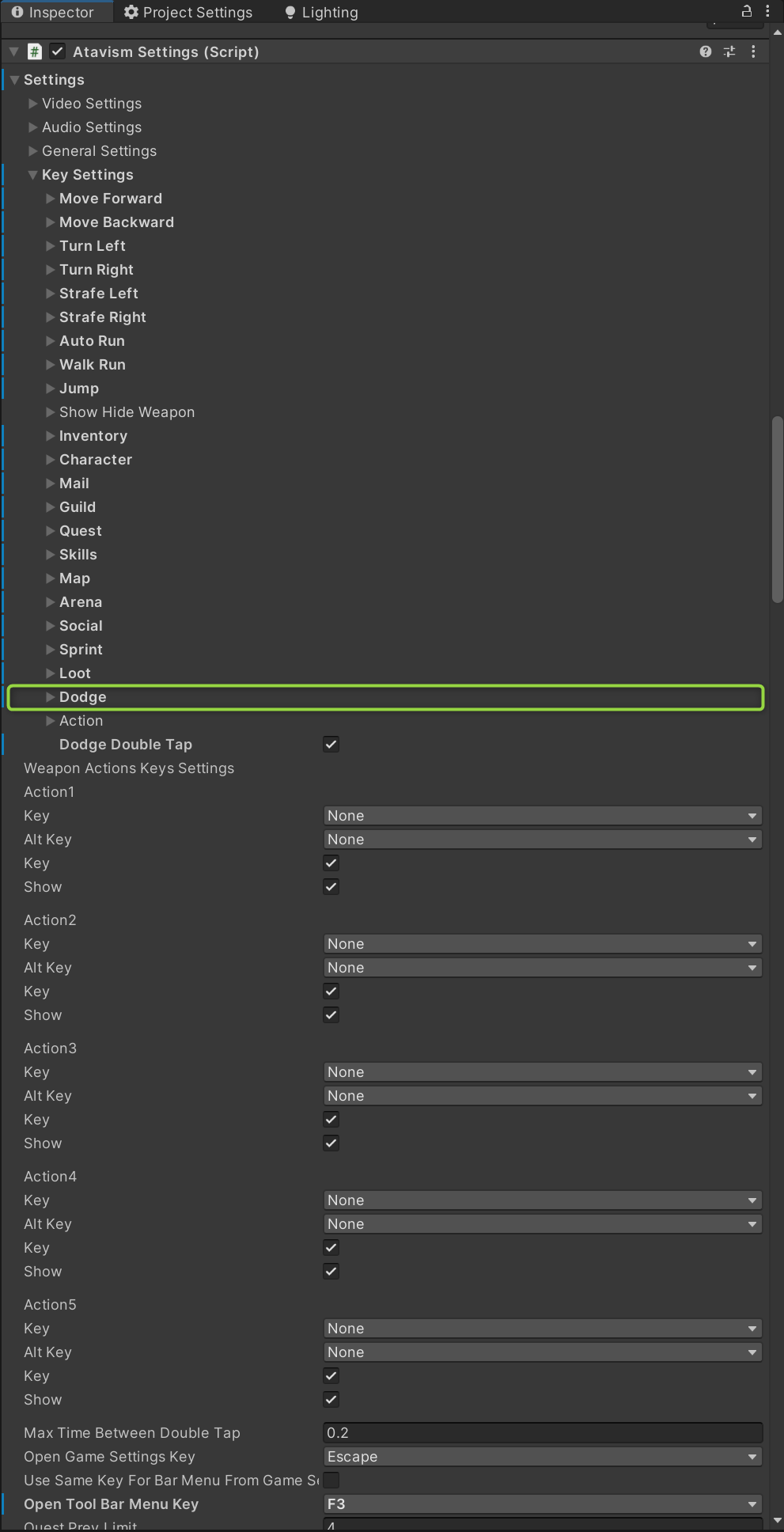 Dodge: Defines the ability that will be used for dodge. which can be bound to the selected key in the Login scene -> Scripts -> Atavism Settings component.
