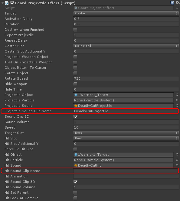 The last stage is putting the name of the clip into the Coordinated Effect Component, it can be Projectile but it should work with any of them. You can also remove the Audio Clip so it wouldn’t be played from the clip but from Master Audio.