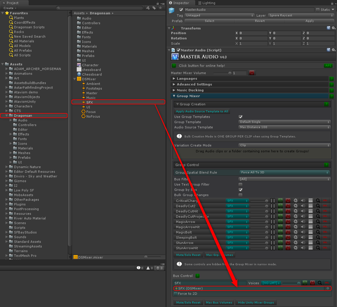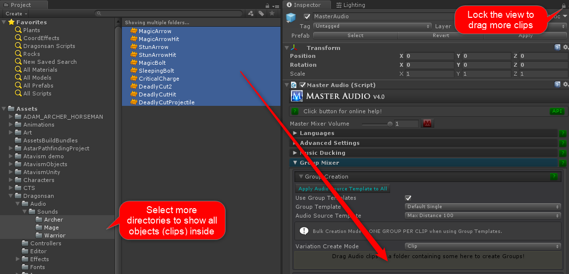 Drag some audio clips to the MasterAudio Prefab in the Inspector (If you want to use it for Atavism Coordinated Effects then you will find some sound examples which we used for Atavism Abilities in the Atavism with Demo Data, in the Assets/Dragonsan/Audio/Sounds/*