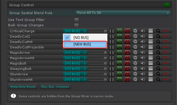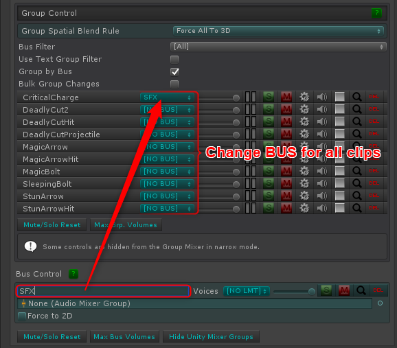 Set some BUS names for the clips, by clicking the NO BUS button and then NEW BUS.