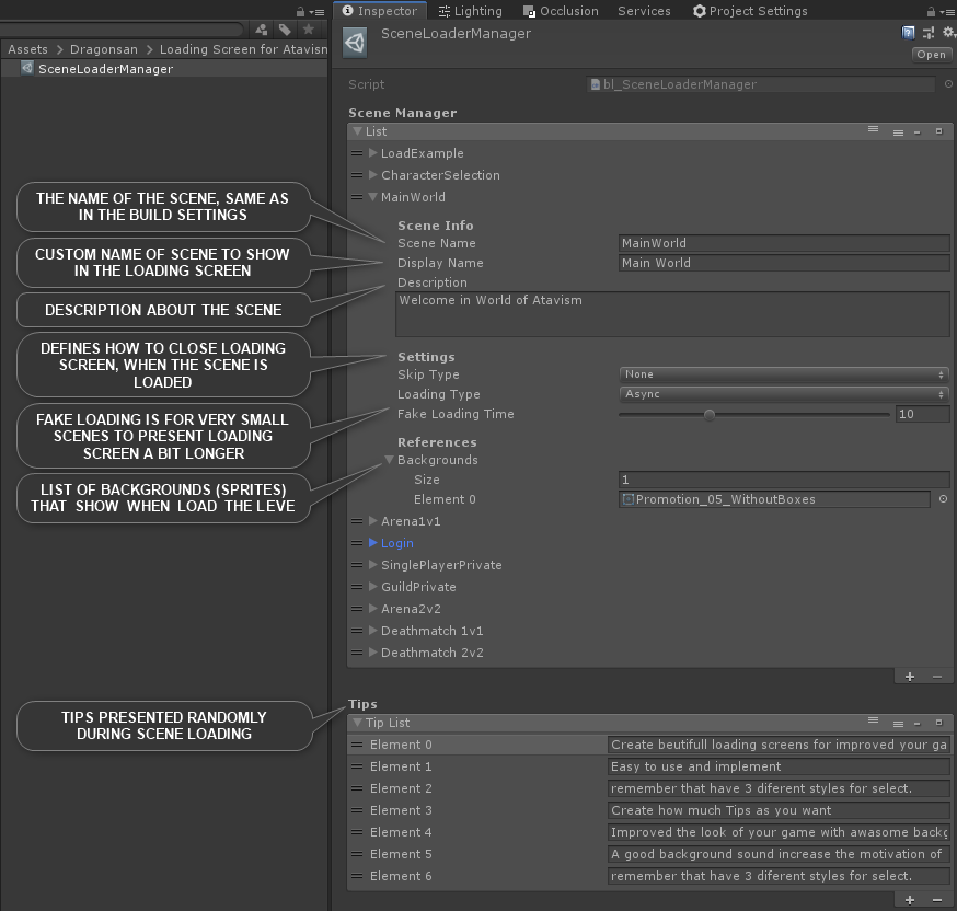 The rest of the prefabs you can find here Assets/Dragonsan/Loading Screen for Atavism/Content/Prefabs/SceneLoaders/ (SceneLoader 1…9) with different loading settings.