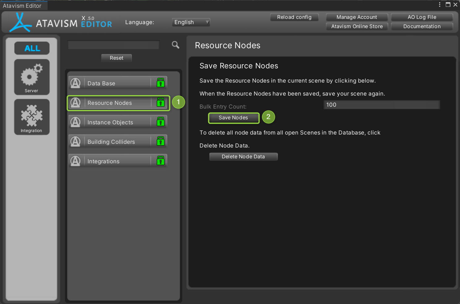 When you place your resource nodes in the scene, you need to save them somehow. This process is super simple and we just have to open Atavism Editor inside Unity.