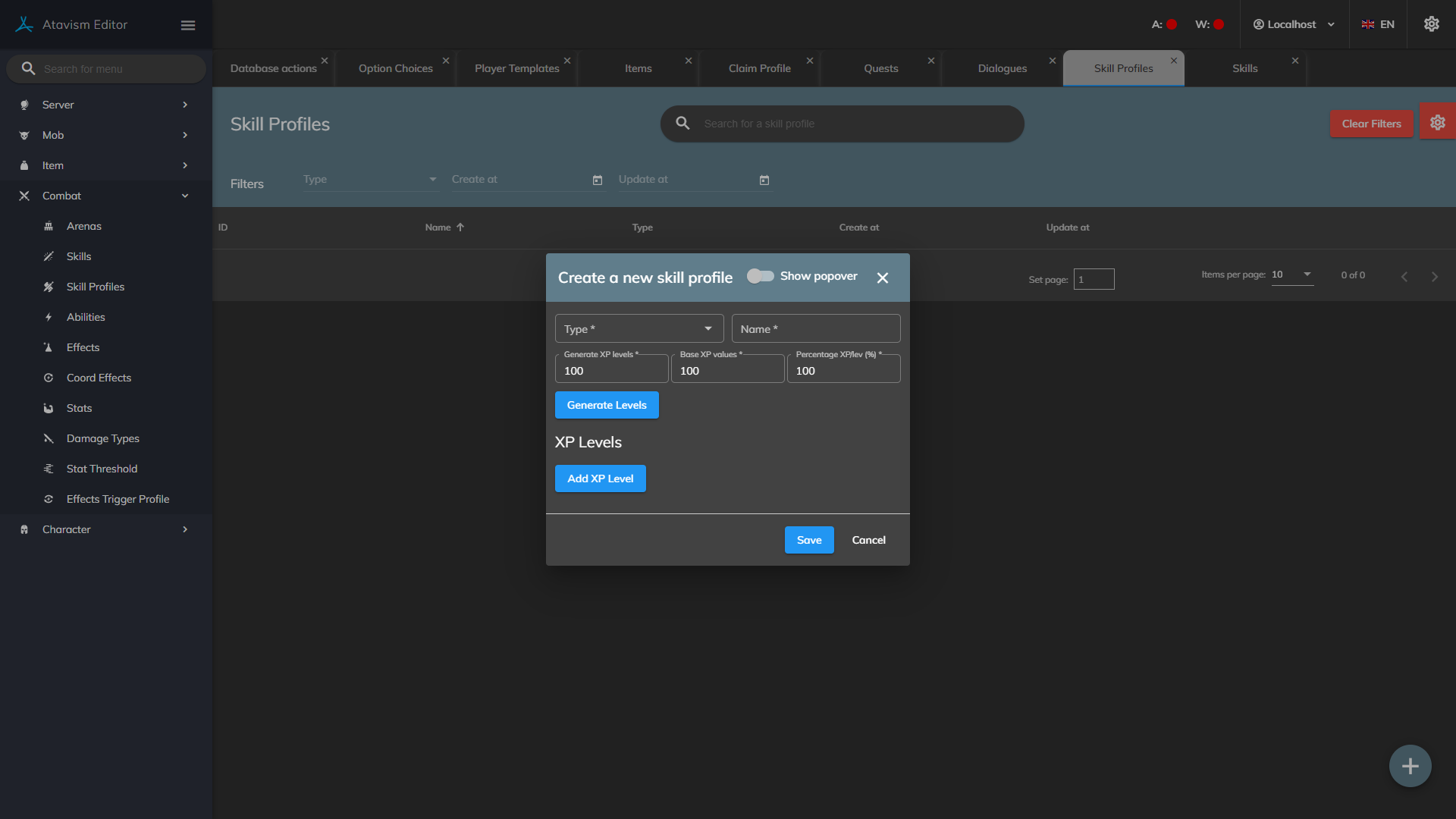 In this module, you can define the experience values required to level the skill or talent to which you will assign this profile.