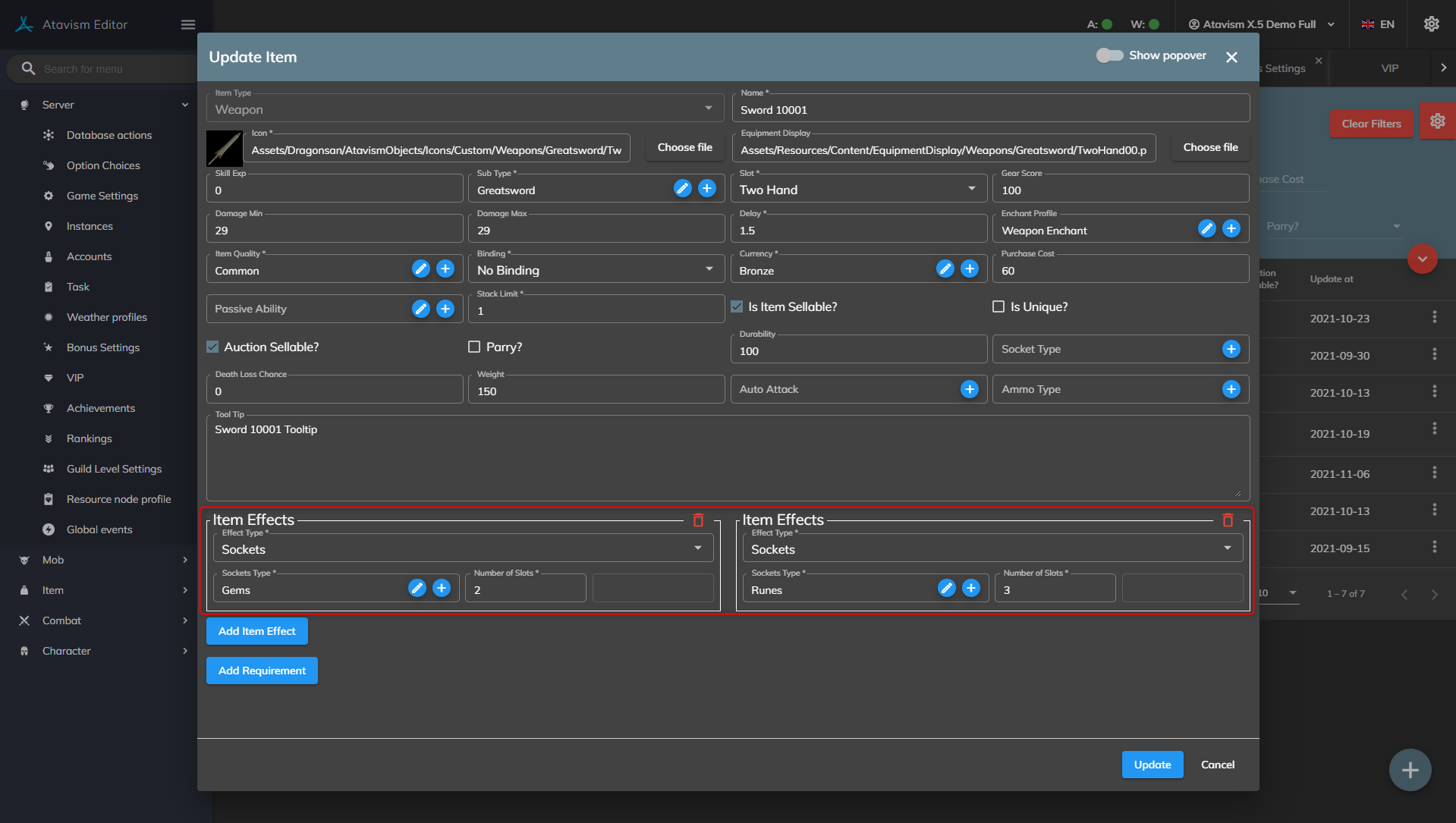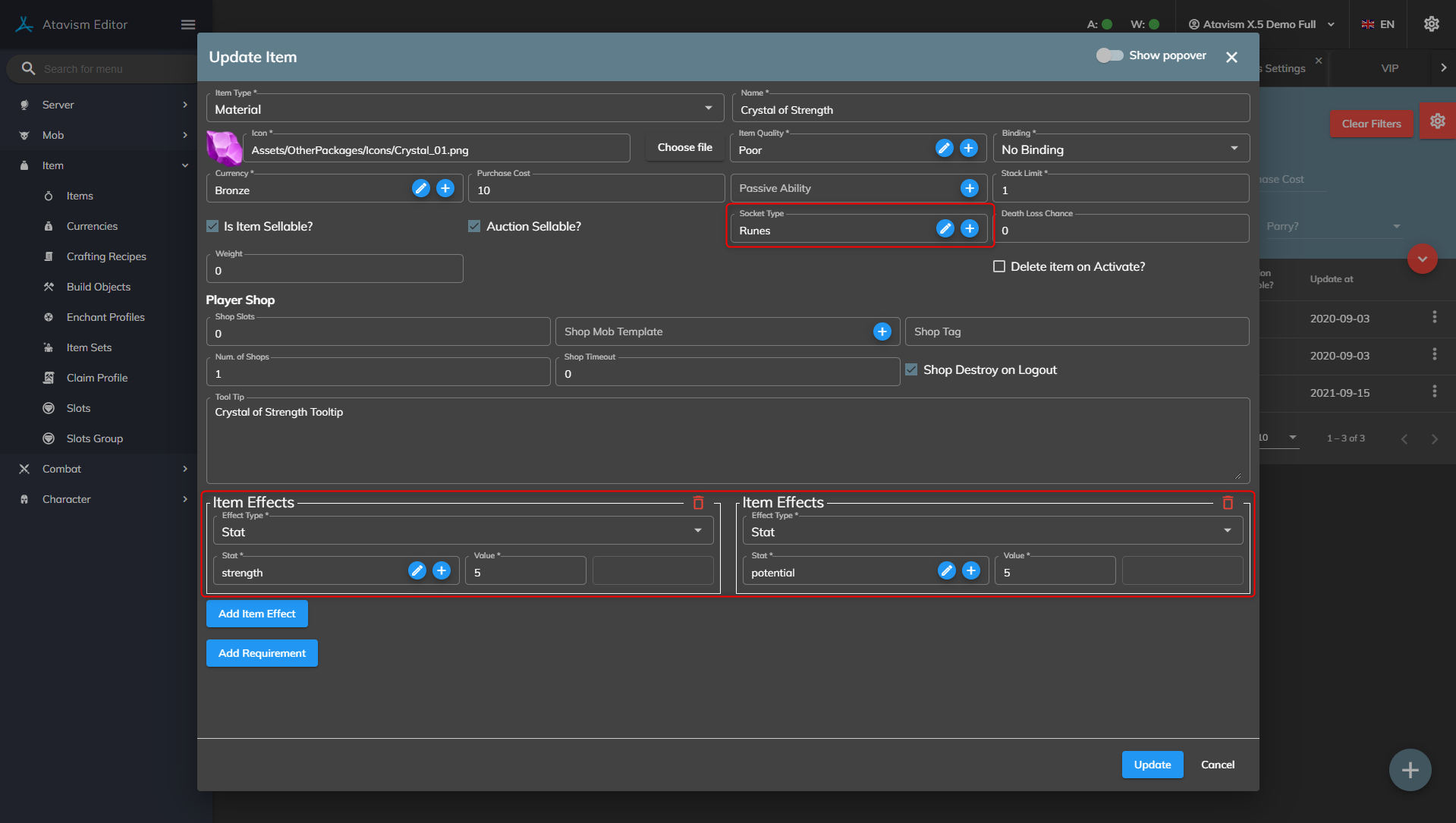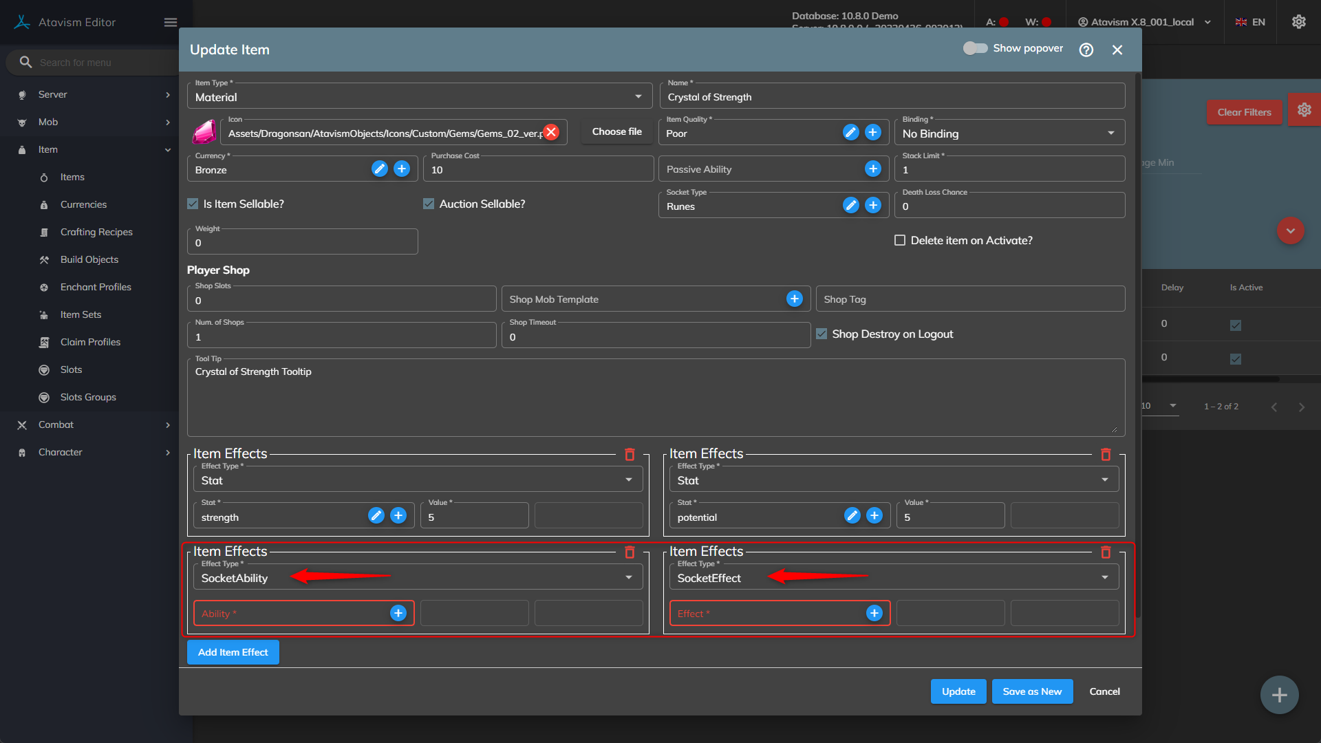 Then you have to configure an item that can be inserted into our Gems or Runes slots, and to do this you have to create an item with a socket defined like this.