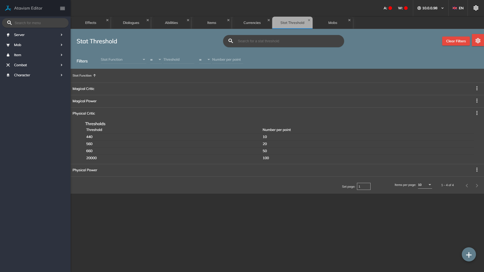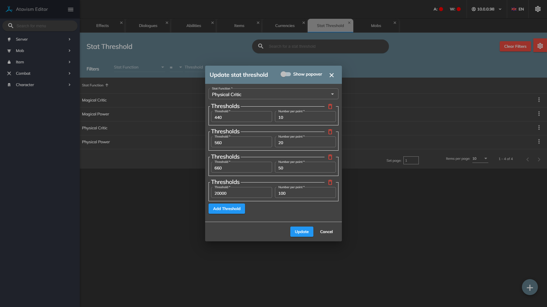 Stat Thresholds lets you define non-linear relation between the number of stat points and percent, for example, you won’t want to have a critical rate to reach 100%, then you can define that every 1 point of a stat defined as Physical Crit or Magical Crit stat function will give your players 1% of the critical chance, but up to 10 points, so if the player will have 10 pints, then he will get 10% in total. Then you may want to have 2 points per 1 percent up to 30 points in total, so if the player will have 30 critical points then he will reach 20% critical rate (10 points to get 10%, then 20 points to get another 10%),.Then you may want to define 5 points per 1% up to 80 points, so 10 points to get 10%, then 20 points to get another 10%, and then 50 points to get another 10%, 80 points to have 30% critical chance. You can define as many thresholds as you want. In games players used to call this type of cap as a soft cap, which means that up to some certain level it’s profitable enough to put points and increase that stat, but after it’s better to put stats into something else.