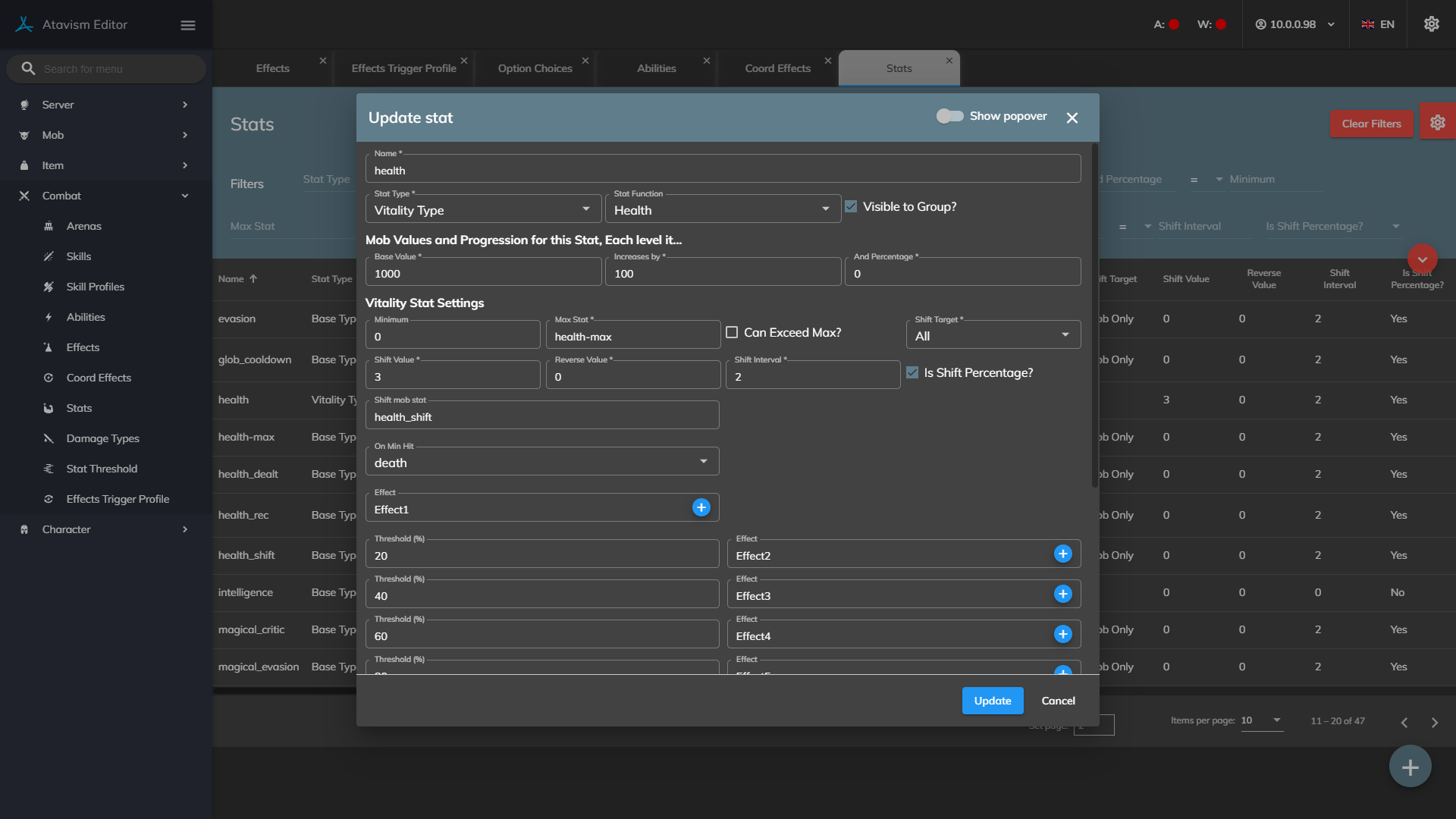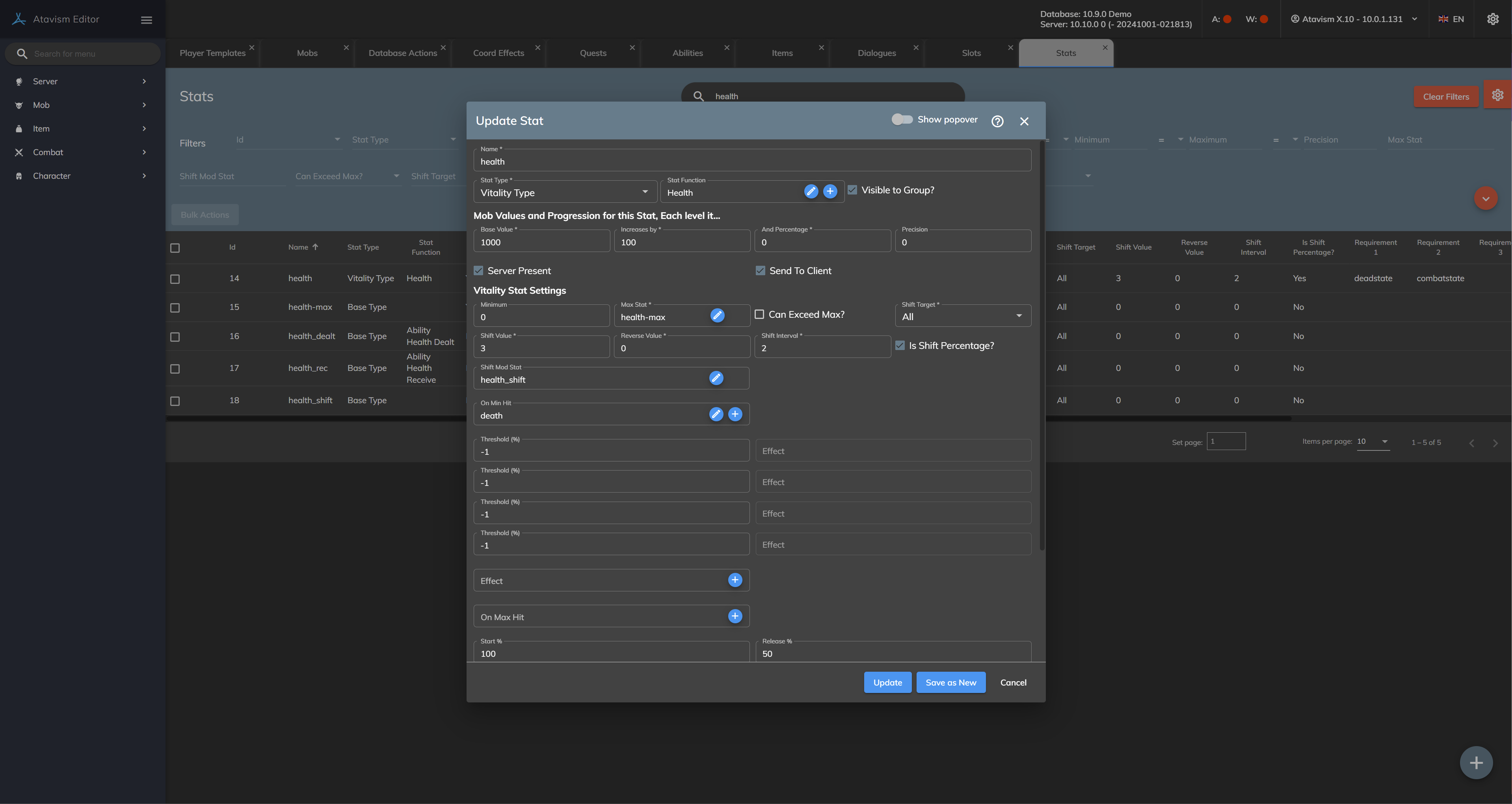 Stat Type: Base Stats are your standard stat such as strength or intelligence. Resistance Stats are used in combat calculations to reduce damage taken. Vitality stats can change by themselves over time and cause actions such as death when reaching their min or max values.