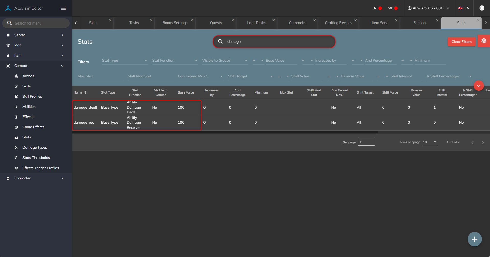 or on the mob itself if you altered all of these stats should be set to 100 if you haven’t changed thresholds, so each point should give 1% of the value for damage received and damage dealt.