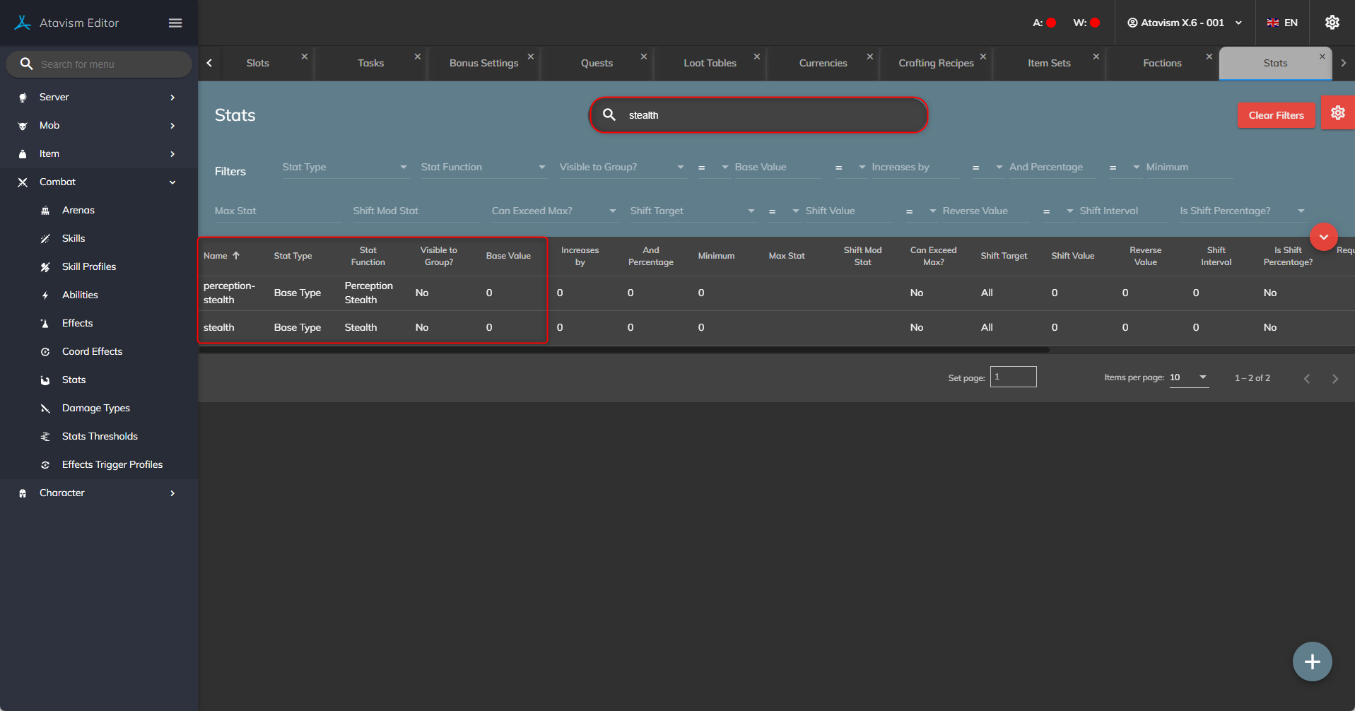 - Atavism has stealth functionality, so players can hide from mobs. This is based on two statistics: stealth and perception-stealth. If the stealth of entity A is higher than the perception stealth of entity B, then entity A won’t be visible to entity B. In other words, if the player will have a higher stealth value than the mob’s perception-stealth stat value, then the mob won’t see the player and won’t be able o attack him. Stats should be checked like in point I. 2. so in the player templates module, but in this case, you usually want to have stealth value at 0 by default for your player, and perception-stealth as 0 or 100, depending on if you want to have some kind of buffer for this or not. Then in-game you can alter your stealth and perception-stealth stats as you want.