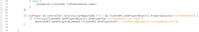 if (isPlayer && controller.velocity.sqrMagnitude > 0.1 && ClientAPI.GetPlayerObject().PropertyExists("currentAnim")) {