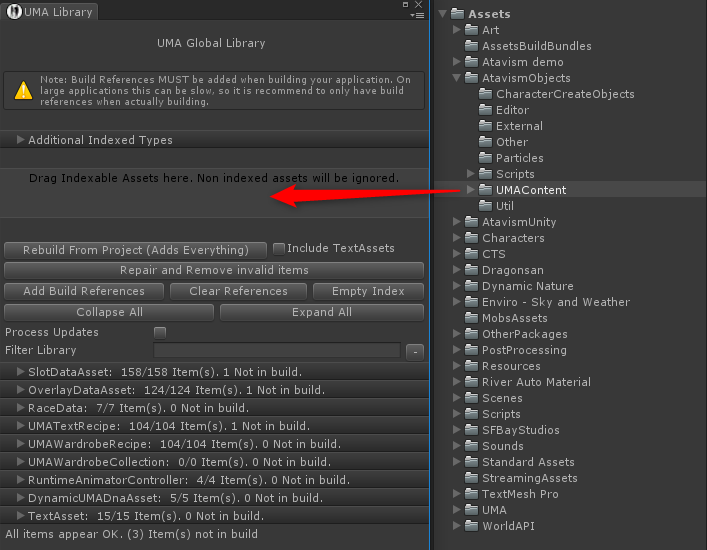4. Drag Assets/Atavism Objects/UMAContent directory into the “Drag Indexable Assets here…” window. For Atavism 2019.1.2+ this step is obsolete.