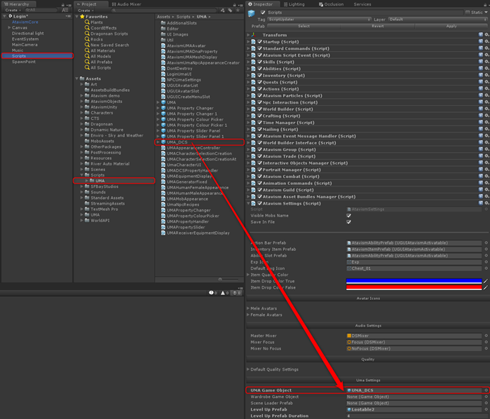 5. Open the Login scene and find the Scripts object, then drag the UMA_DCS prefab from Assets/Scripts/UMA to the AtavismSettings component into the UMA Game Object variable.