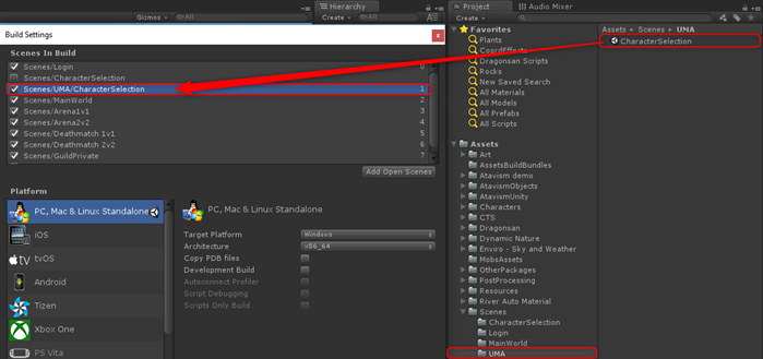 6. In the player build section replace the previously added CharacterSelection scene with the one from Assets/Scenes/UMA/CharacterSelection