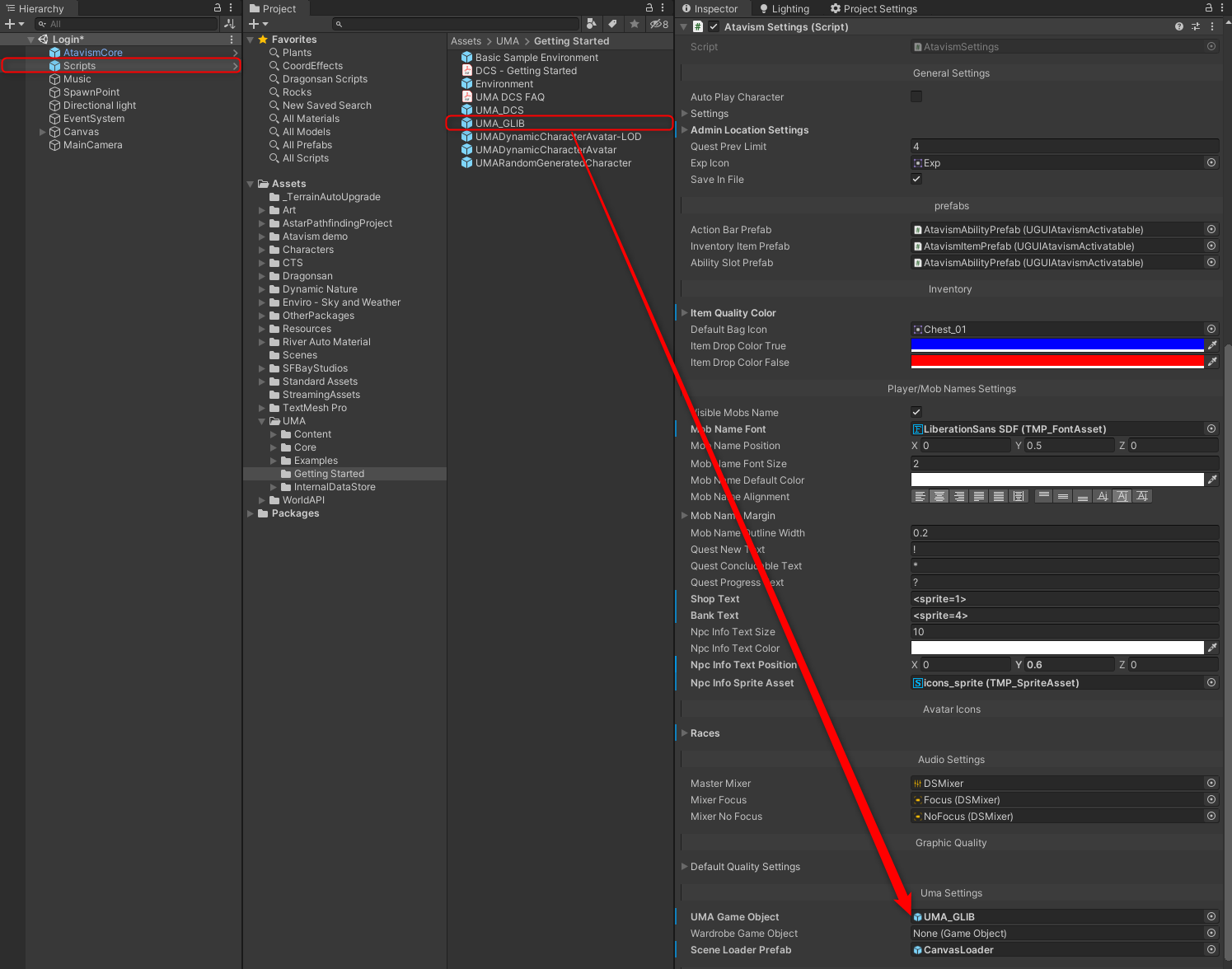 3. Open the Login scene and find the Scripts object, then drag the UMA_GLIB prefab from Assets/Scripts/UMA to the AtavismSettings component into the UMA Game Object variable.