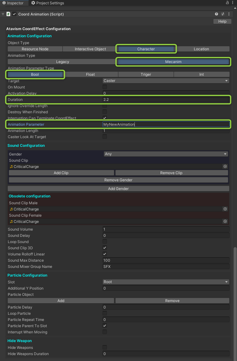 - The last step is to trigger this somehow. You can do this through coordinated effect scripts, for example, the Coord Animation script. Remember to set the Object Type as Character, the Animation Type as Mecanim, and the Animation Parameter Type as Bool, because we set it as Bool in our Animator, and of course, set the Animation Parameter as the Animator parameter name which we created earlier, MyNewAnimation. You can set the duration which is in seconds. More about coordinated effects and how to use them you can find here.