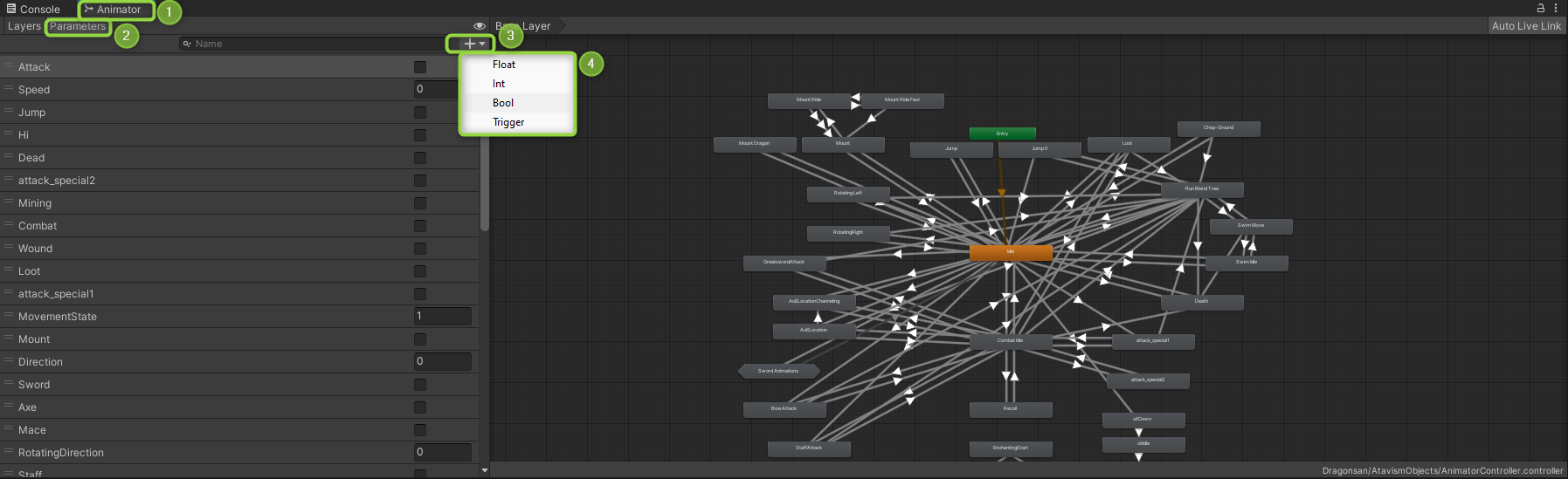 - Open the default controller used for your player which is located in the Assets/Dragonsan/AtavismObjects/AnimationController
