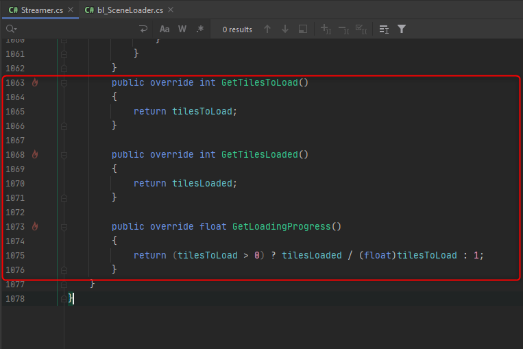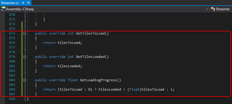 public override int GetTilesToLoad() { return tilesToLoad; } public override int GetTilesLoaded() { return tilesLoaded; } public override float GetLoadingProgress() { return (tilesToLoad > 0) ? tilesLoaded / (float)tilesToLoad : 1; } - Insert below code into Awake function