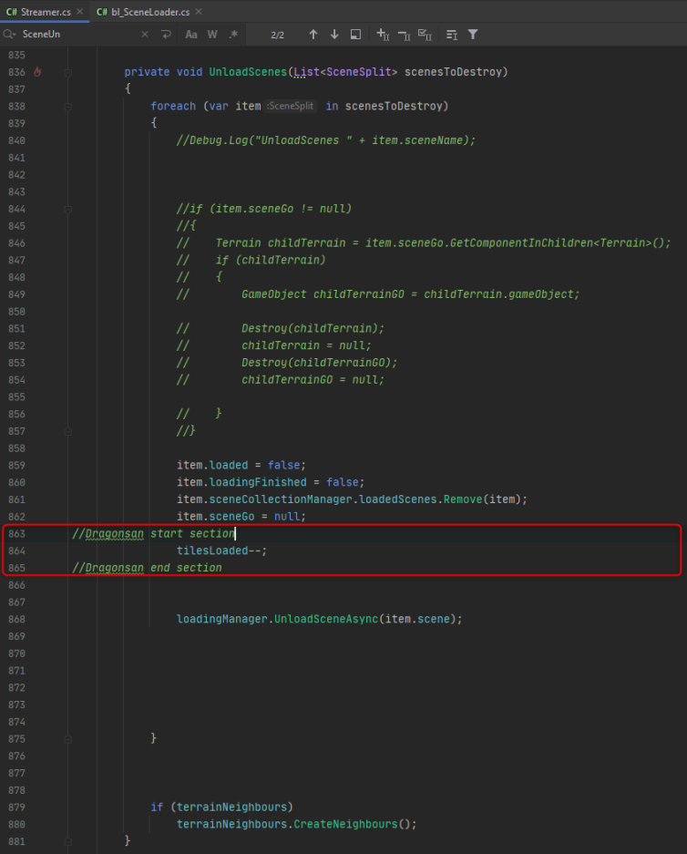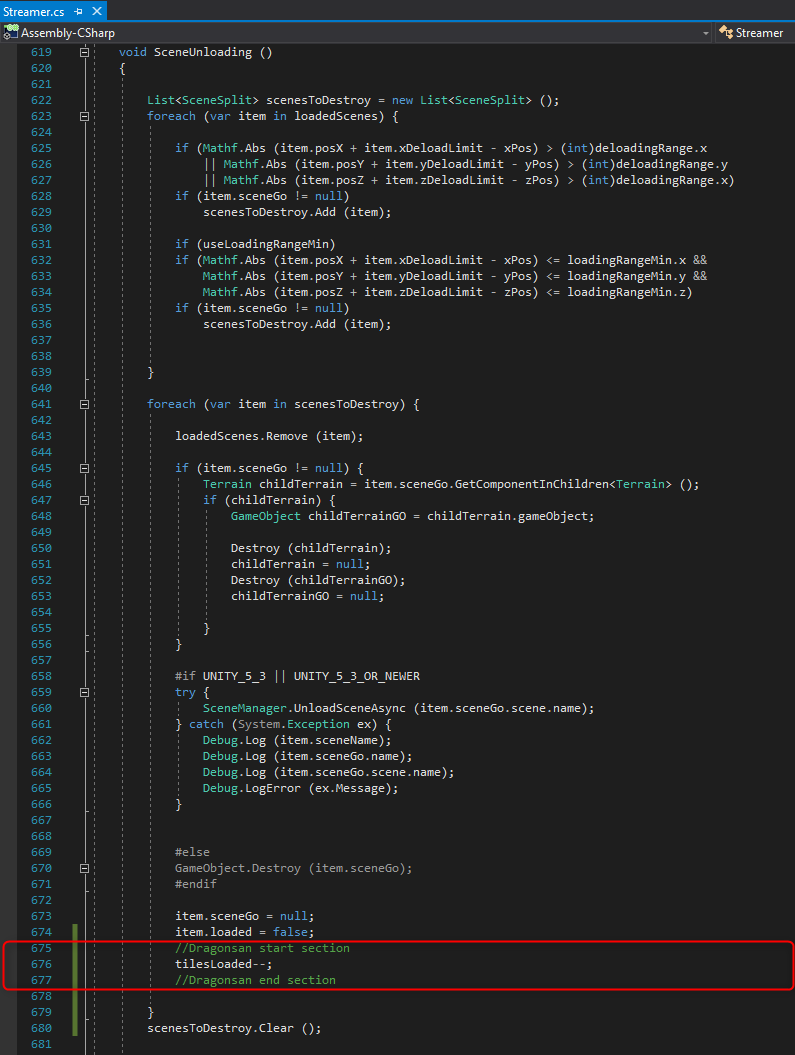 private void UnloadScenes(List<SceneSplit> scenesToDestroy) { foreach (var item in scenesToDestroy) { //Debug.Log("UnloadScenes " + item.sceneName); //if (item.sceneGo != null) //{ // Terrain childTerrain = item.sceneGo.GetComponentInChildren<Terrain>(); // if (childTerrain) // { // GameObject childTerrainGO = childTerrain.gameObject; // Destroy(childTerrain); // childTerrain = null; // Destroy(childTerrainGO); // childTerrainGO = null; // } //} item.loaded = false; item.loadingFinished = false; item.sceneCollectionManager.loadedScenes.Remove(item); item.sceneGo = null; //Dragonsan start section tilesLoaded--; //Dragonsan end section loadingManager.UnloadSceneAsync(item.scene); } - Insert below code into the bl_SceneLoader file