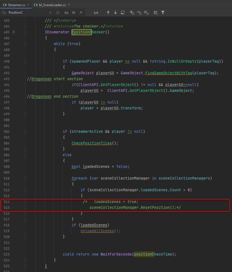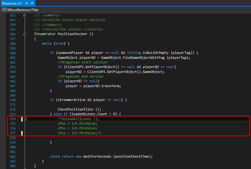 IEnumerator PositionChecker () { while (true) { if (spawnedPlayer && player == null && !string.IsNullOrEmpty (playerTag)) { GameObject playerGO = GameObject.FindGameObjectWithTag (playerTag); //Dragonsan start section if(ClientAPI.GetPlayerObject() != null && playerGO==null) playerGO = ClientAPI.GetPlayerObject().GameObject; //Dragonsan end section if (playerGO != null) player = playerGO.transform; } if (streamerActive && player != null) { CheckPositionTiles (); } else if (loadedScenes.Count > 0) { UnloadAllScenes (); xPos = int.MinValue; yPos = int.MinValue; zPos = int.MinValue; } yield return new WaitForSeconds (positionCheckTime); } } - Comment these selected lines