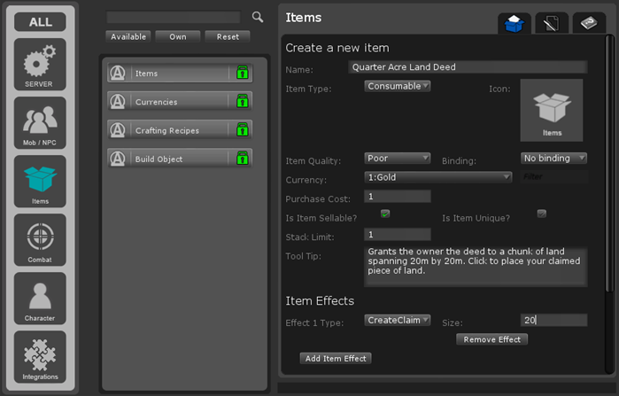 - “仅作为项目”可用于隐藏World Builder UI中“创建物件”列表中的项目,这意味着他们必须单击其库存中的项目才能放置物件。