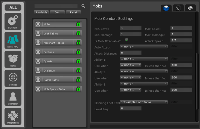 现在您已经正确设置了模型,您必须使用Atavism Unity Editor中的Mob插件将mob添加到数据库中。每次在Atavism Unity Editor中进行任何更改时,请务必重新启动服务器。打开Mob Spawner窗口