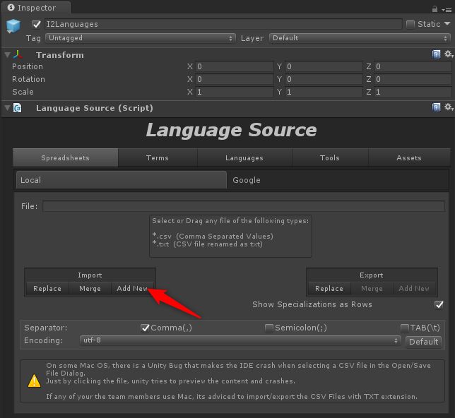 如果在术语列表中不存在此类键,则可以通过单击添加术语到源按钮来添加它。 如果您想要像Google电子表格这样更高级的配置,请阅读作者文档页面:http://inter-illusion.com/assets/I2LocalizationManual/Features.html