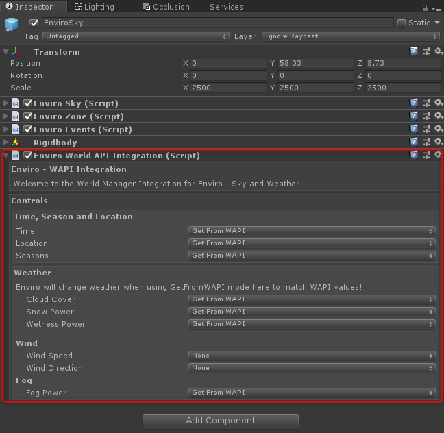 - 将EnviroSky预制件从Assets / Enviro – 动态环境/预制/目录拖到场景中,将Enviro World API集成组件添加到其中,并将元素设置为Get From WAPI,如下面的屏幕所示